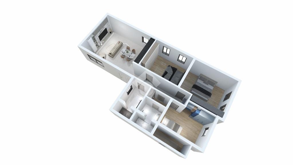 Sulla destra rispetto all’ingresso si accede alla zona notte, nella quale troviamo una prima camera matrimoniale ed un primo bagno seguiti poi da ulteriori due camere di cui una matrimoniale ed una singola ed un secondo bagno finestrato, dal quale insieme al primo bagno si accede ad un secondo disimpegno ad uso ripostiglio. La soluzione sarà dotata di riscaldamento autonomo con impianto a pavimento.