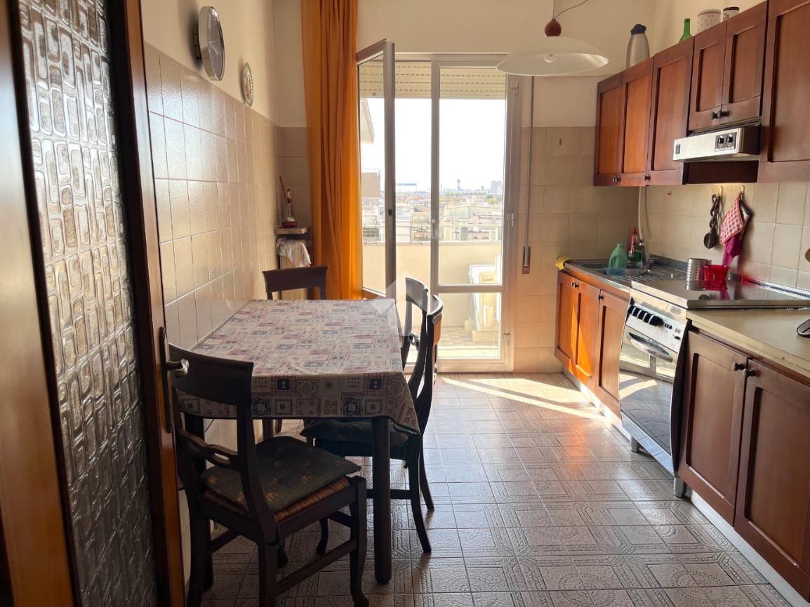 All’ingresso della palazzina troveremo l’accesso all’ascensore per raggiungere il settimo piano dove troveremo un vano scale composto di soli due appartamenti. Varcata la soglia d’ingresso del nostro appartamento, ci troveremo in un ampio disimpegno che suddivide la soluzione in due zone: di fronte a noi si sviluppa la zona giorno che si compone di una cucina abitabile ed un soggiorno altrettanto grande, entrambi con accesso ad una terrazza di generose dimensioni dove è possibile posizionare anche un tavolo per poter consumare pranzi e cene in compagnia.